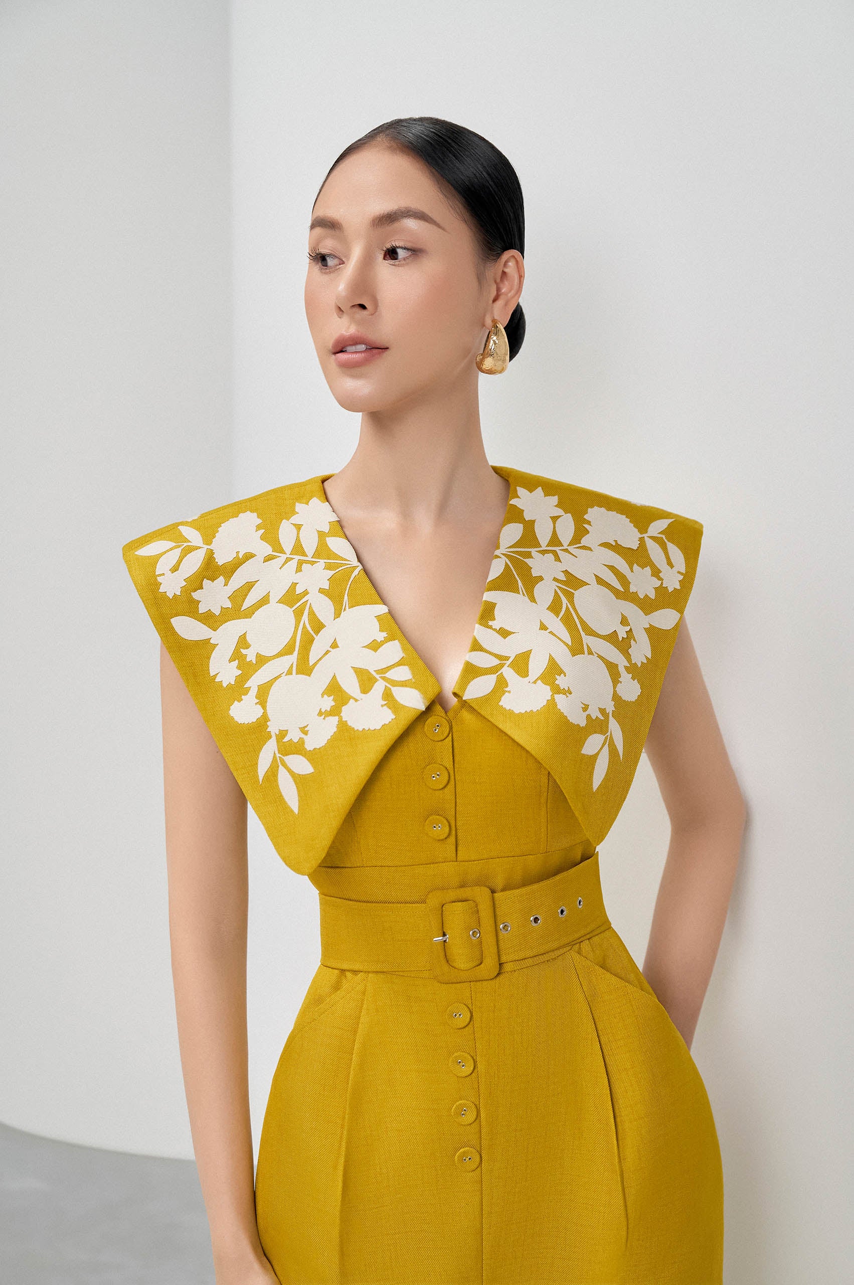 This fitted pencil dress is designed with a high neckline and knitted sleeves, combining modernity and elegance. Inspired by a tank top structure, it features sporty lines that provide comfort and style. The asymmetrical waist and metallic ring detail at the hip add a unique and striking touch, making it versatile for various styling options.