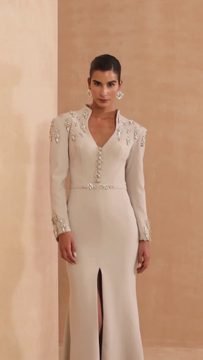 Discover the elegant and stylish MNM Couture V02030 dress from the Fall 2024 evening collection. Perfect for special occasions such as evening events, mother of the bride attire, or plus size fashion. Crafted from high-quality crepe fabric, this fitted dress features a train, slit, and buttons for a sophisticated touch. The long length and zipper closure at the back add to its chic and modern look. With a classic V-neckline and long sleeves, this dress is a must-have from the renowned brand, MNM Couture.