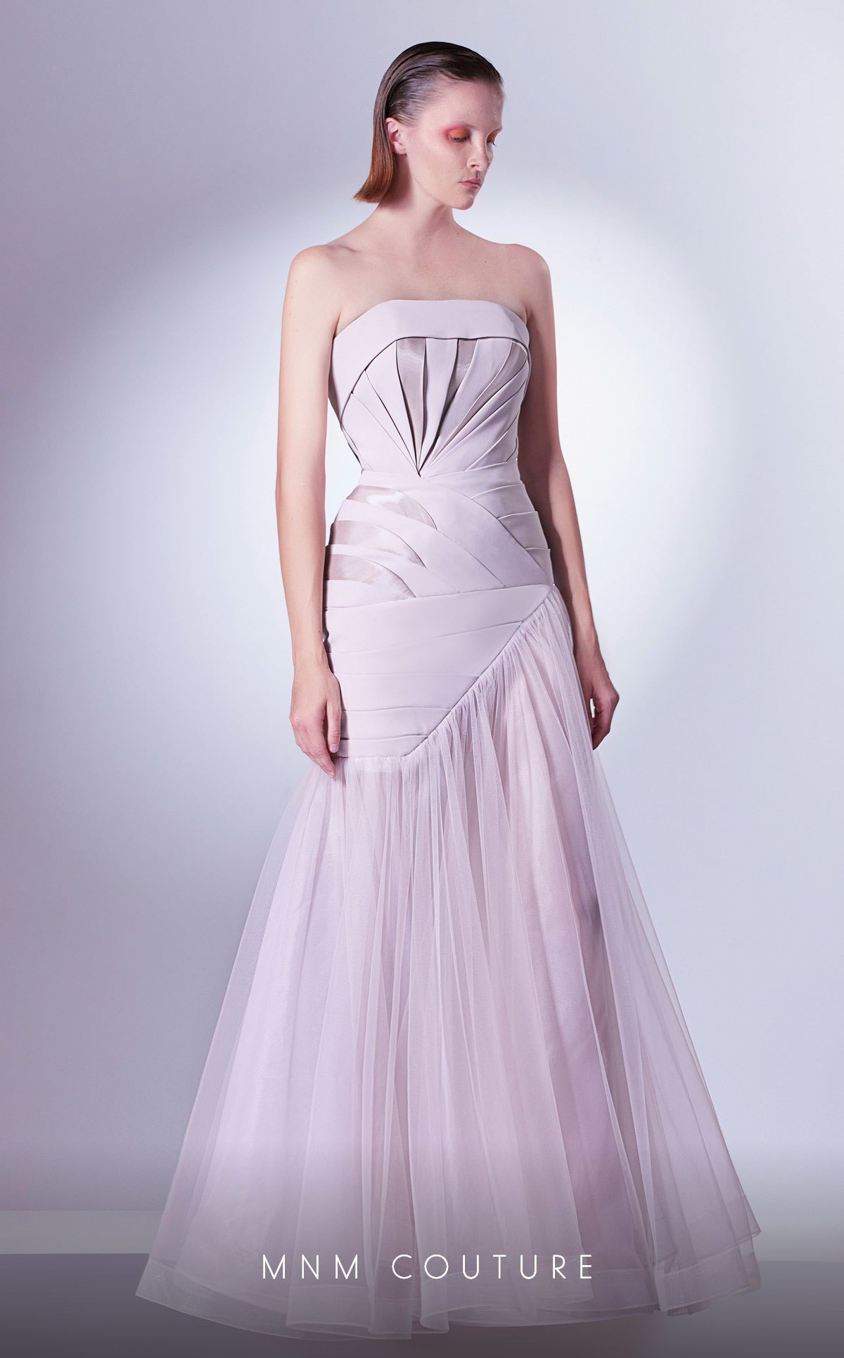 An aristocratic couture gown of Satin and Tulle that awaits your finest jewellery and long gloves to complete the vision. The strapless bodice trimmed with Satin, transitions to a criss-cross pattern of Satin weaves below the waist, followed by a full skirt of soft Tulle.
