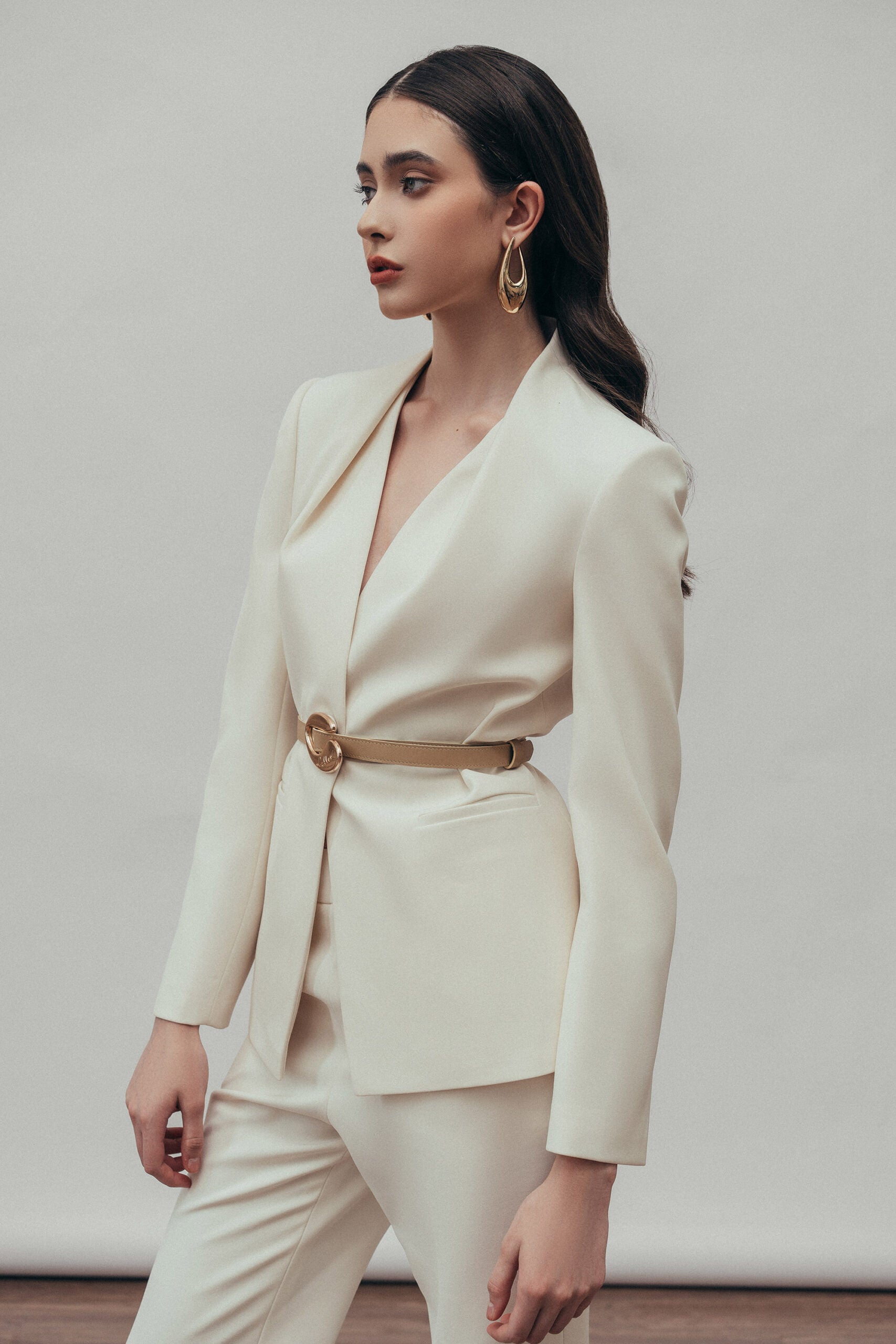 A relaxed-fit blazer with a deep V-neckline and soft draping details, designed for both style and comfort. The waist is subtly cinched with a leather belt featuring a metallic buckle, enhancing the silhouette while maintaining a modern aesthetic. Ideal for a variety of events, this versatile piece pairs effortlessly with fitted dresses, skirts, or wide-leg trousers.