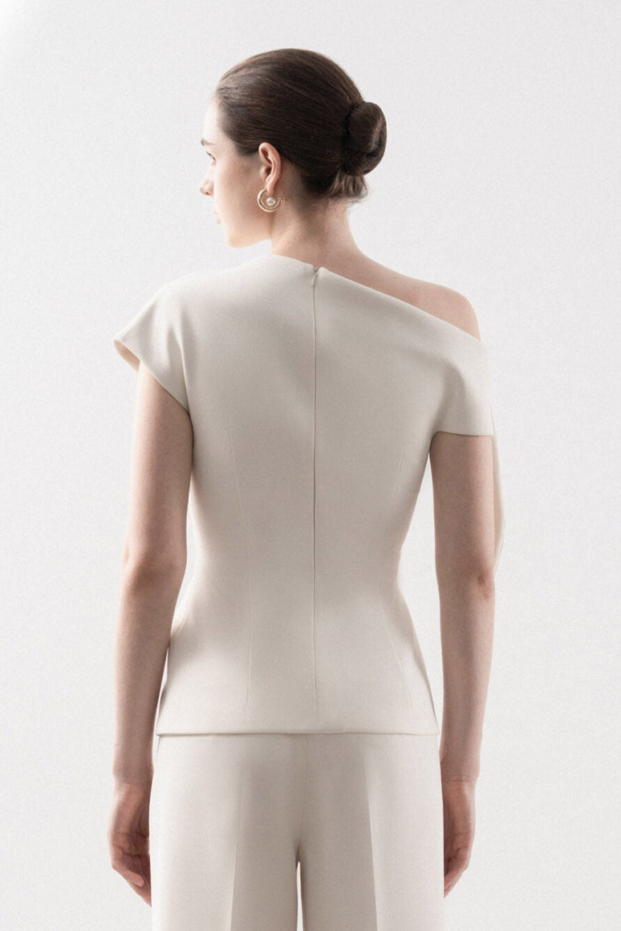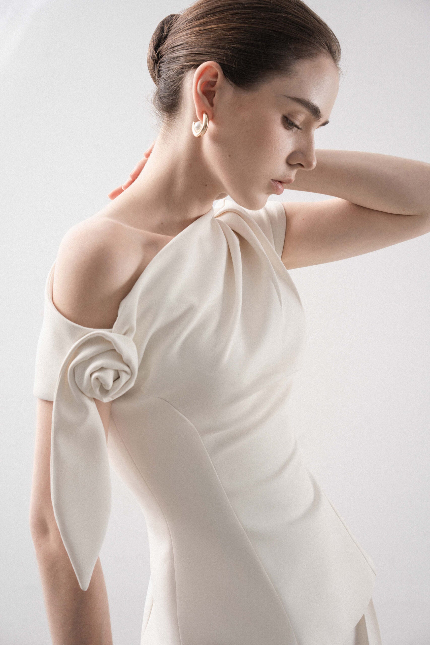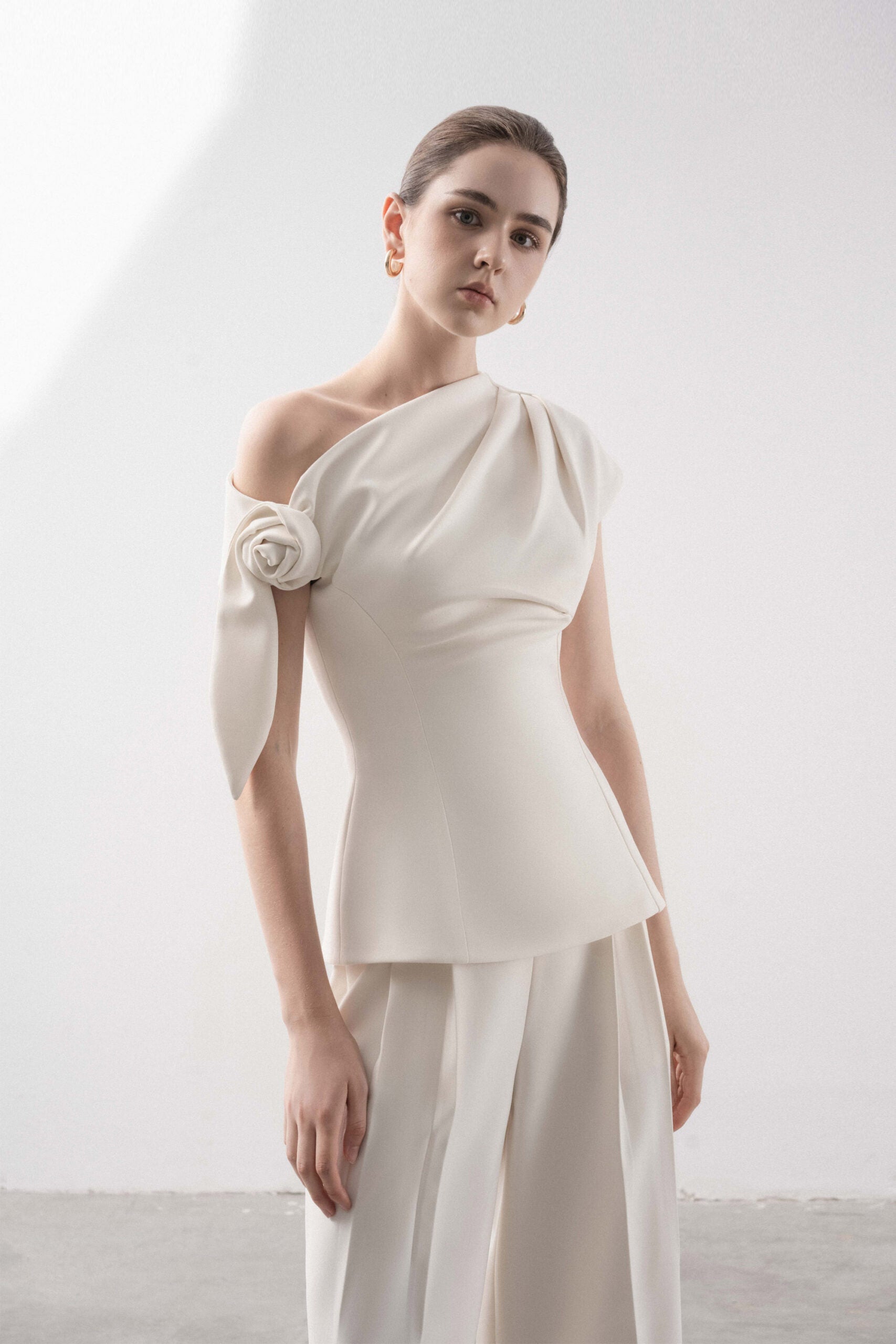 The Bambalina Cross-collar Blouse is a peplum design featuring an off-shoulder detail that elegantly showcases the shoulder. The asymmetric cross-collar with soft pleats accentuates the neckline while 3D floral draping detail adding a distinctive touch.