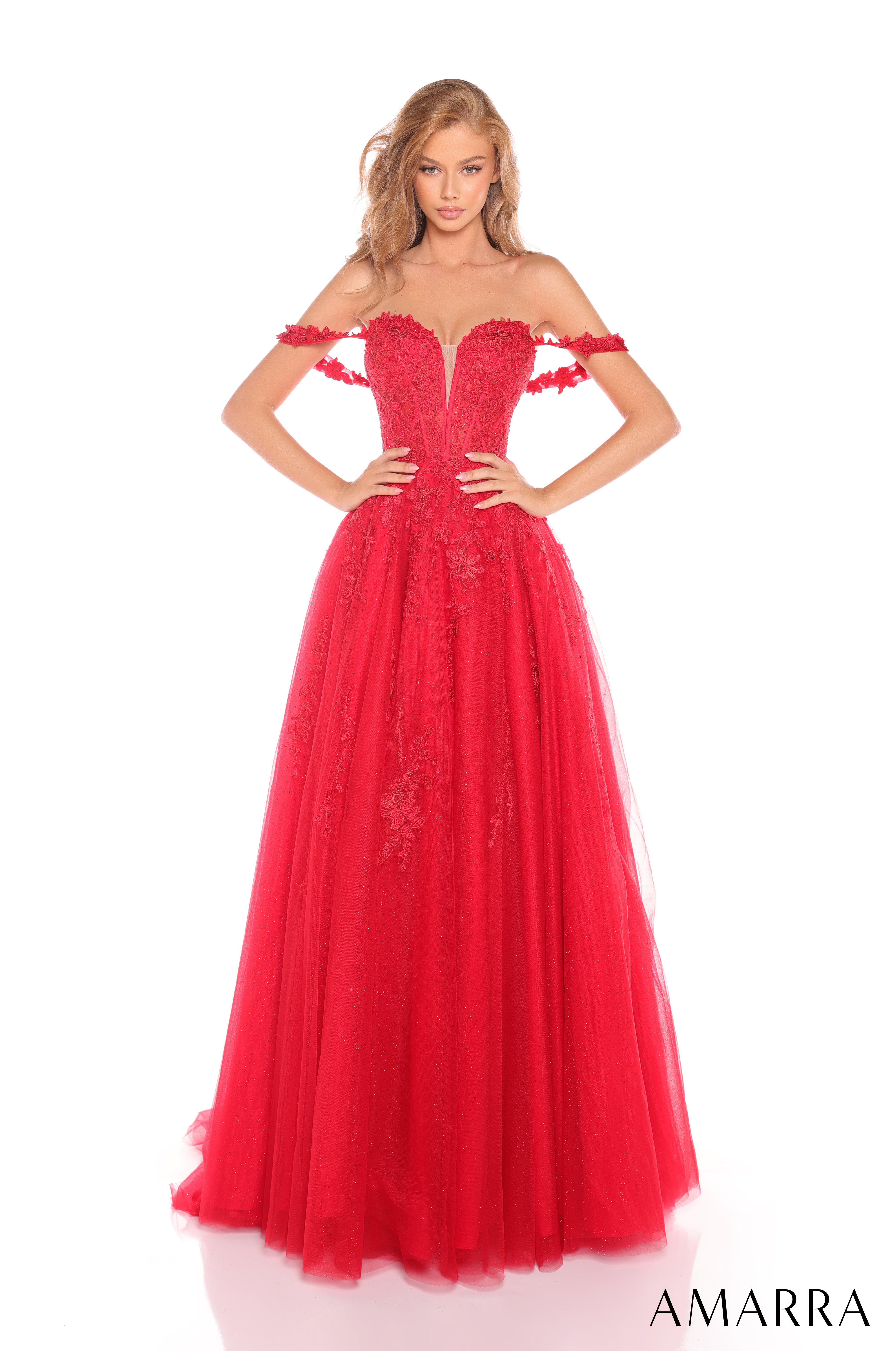 This breathtaking ball gown features a daring plunging V-neckline that leads into a sheer corset bodice, intricately adorned with delicate floral lace embroidery. Graceful off-the-shoulder sleeves add a romantic touch, framing the bust beautifully. The bodice seamlessly transitions into a voluminous floor-length skirt, creating the classic ball gown silhouette. The tulle skirt is embellished with scattered lace embroidery and shimmering details, adding depth and a magical quality to the ensemble. With a lace-up back, which would ensure a perfect fit and add an extra element of allure.