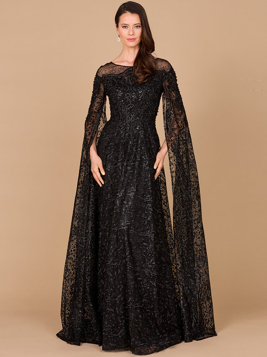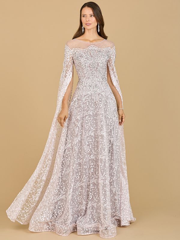 Long sleeve textured lace gown with sparkling stones and embroidery throughout featuring unique puff shoulder details. This gorgeous ballgown offers a modest design and is sure to be the center of attention at your next event with a v-neck and closed back. Great for a mother of bride or mother of the groom dress.