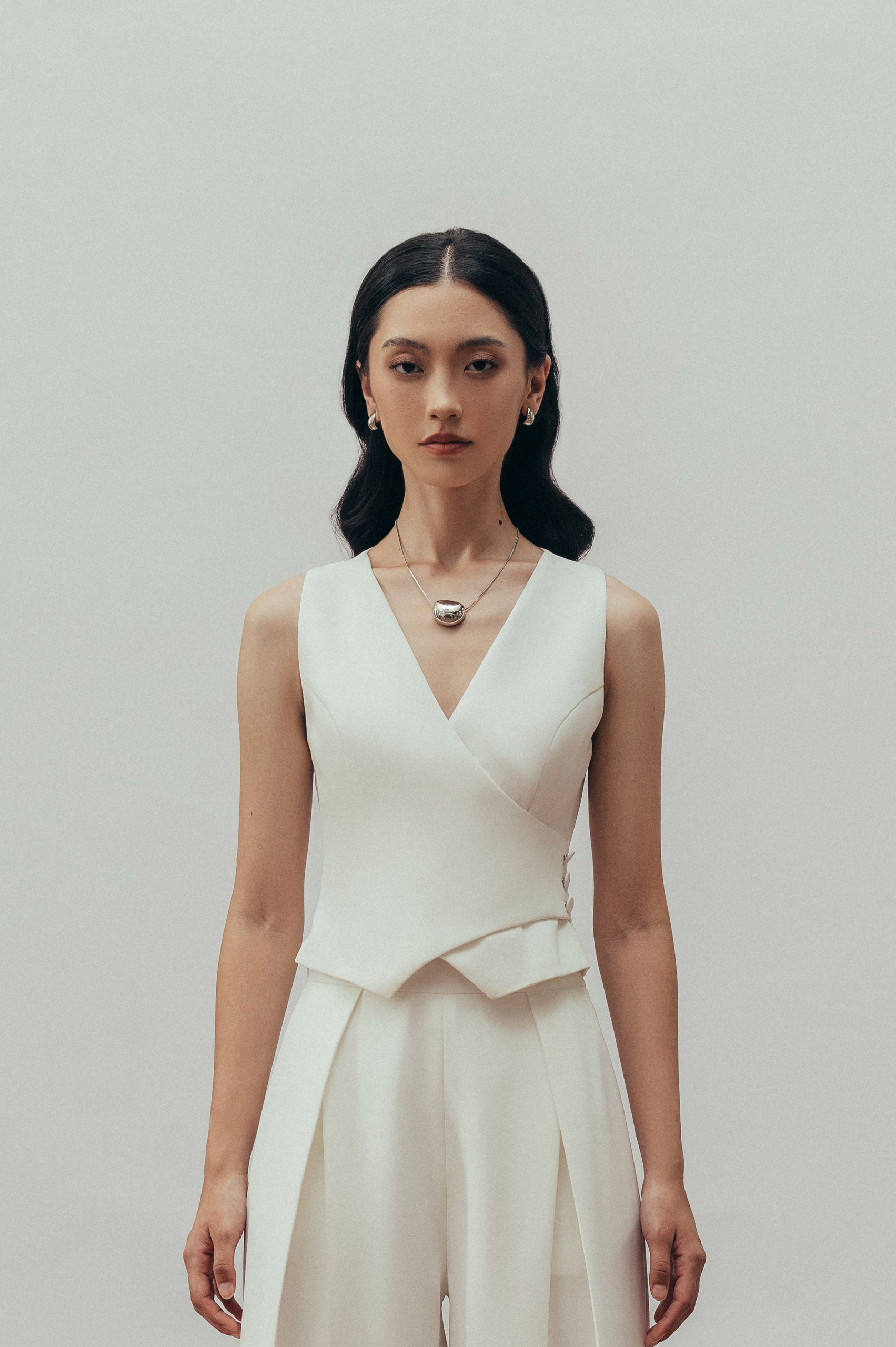 This short fitted gilet enhances the wearer’s silhouette with its sleek, modern look. The sleeveless design, featuring a sophisticated V-neck and elegant crossover lapel, adds a contemporary touch to this timeless piece. Made from smooth, wrinkle-free twill fabric with a slight drape, this gilet is versatile and easily pairs with wide-leg pants, skirts, or a blazer for a chic, modern outfit.