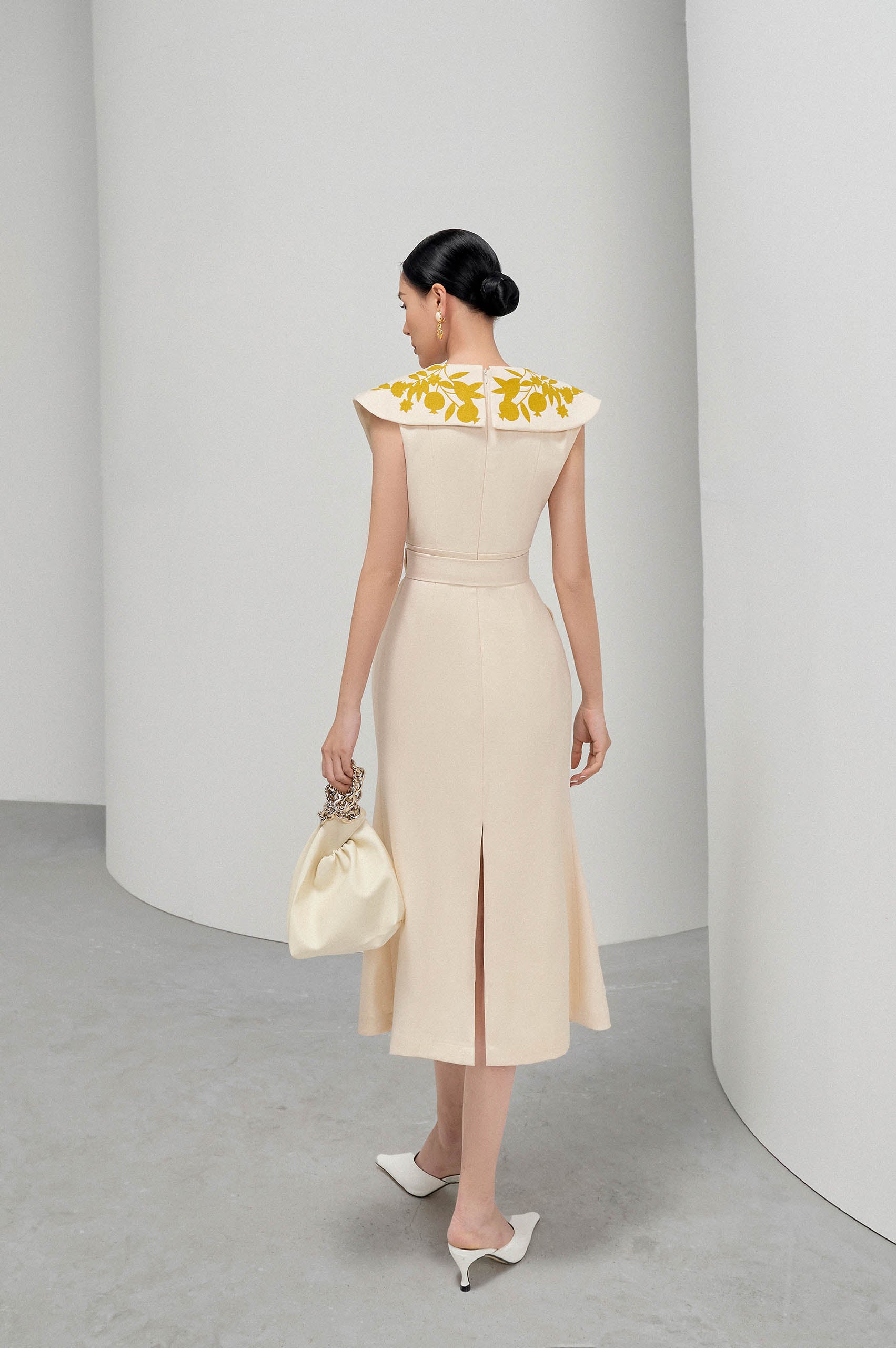 Ivory Square Collar Dress is an item for girls who are looking for an item that is both luxurious, polite and equally dynamic.The square neck design covers the biceps defects and the light fishtail form with the large soup cup creates a softer effect when moving.Using laser cutting technique to create textures for the ancient leaves is a prominent and luxurious highlight of the design.