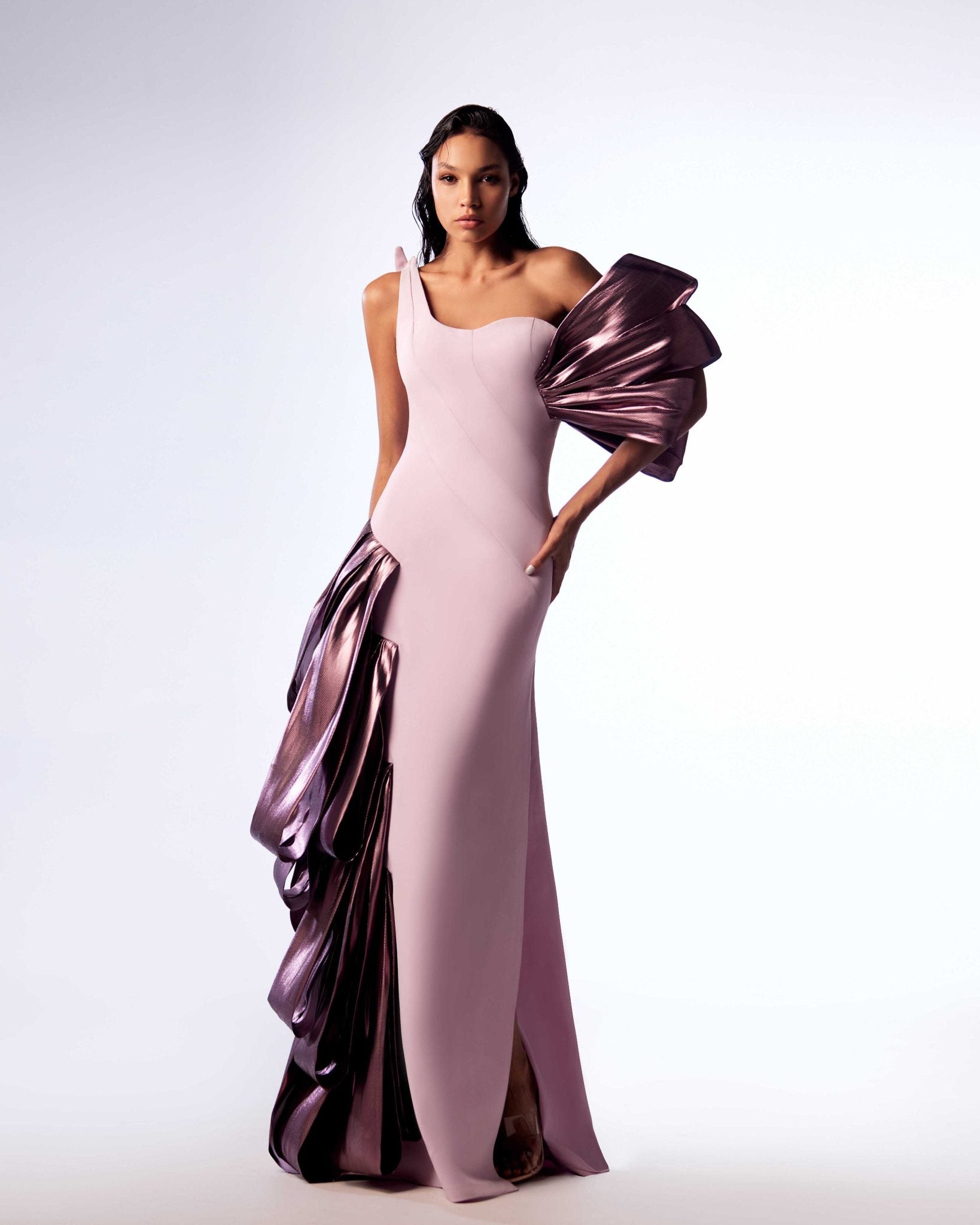 This dress is the epitome of modern sophistication, crafted in a soft pink crepe that skims the body in a straight silhouette. The off-shoulder detail in a metallic pink hue adds an unexpected twist of glamour, elegantly cascading down one side to create a fluid, dynamic effect that captivates with every step. Perfect for those who wish to make a bold yet refined statement, this dress is a celebration of feminine strength and style.