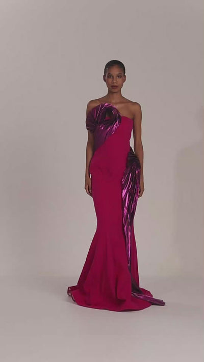 Unleash your inner diva with this striking fuchsia gown, meticulously crafted from crepe, in a form-fitting silhouette that exudes elegance, while the metallic fabric creates an avant-garde flair. This bust design features a mesmerizing swirl of shimmering purple metallic fabric that cascades from the bodice to the hem, adding a touch of futuristic glam. Perfect for red carpet events or high-profile soirées, this dress guarantees you’ll captivate every gaze in the room.